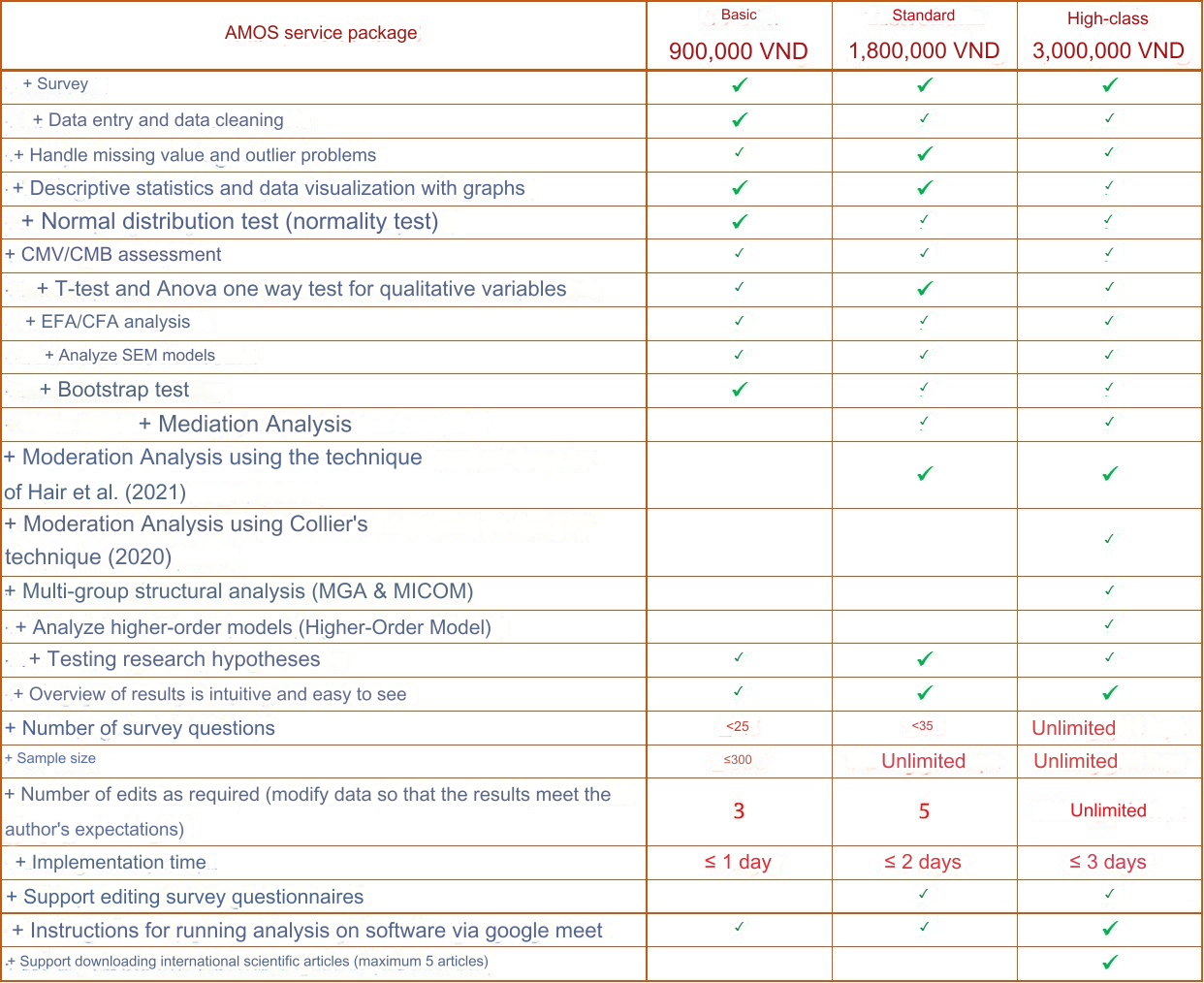 - Costs will be calculated according to each package mentioned above. Le Minh data service does not require a deposit in advance, the results will be shown to you in advance via google meet, only then payment will be made if you are satisfied.