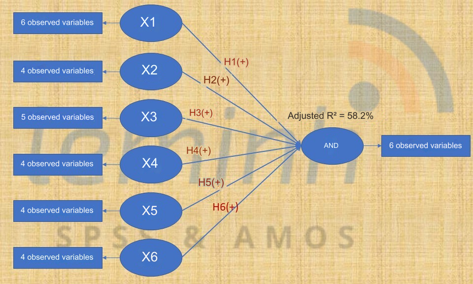 • Description: The model has 6 independent variables from X1 to X6, and 1 dependent variable Y. Variable X1 has 6 observed variables; Variable X2 has 4 observed variables; Variable X3 has 5 observed variables; Variable X4 has 4 observed variables; Variable X5 has 4 observed variables; Variable X6 has 4 observed variables; and variable Y has 6 observed variables.