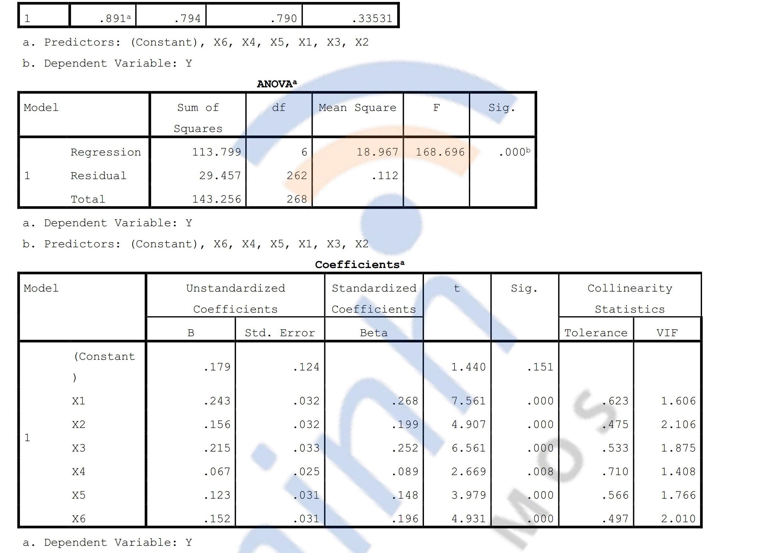 - Description: The model has 6 independent variables from X1 to X6, and 1 dependent variable Y. Variable X1 has 6 observed variables; Variable X2 has 4 observed variables; Variable X3 has 5 observed variables; Variable X4 has 4 observed variables; Variable X5 has 4 observed variables; Variable X6 has 4 observed variables; and variable Y has 6 observed variables.
