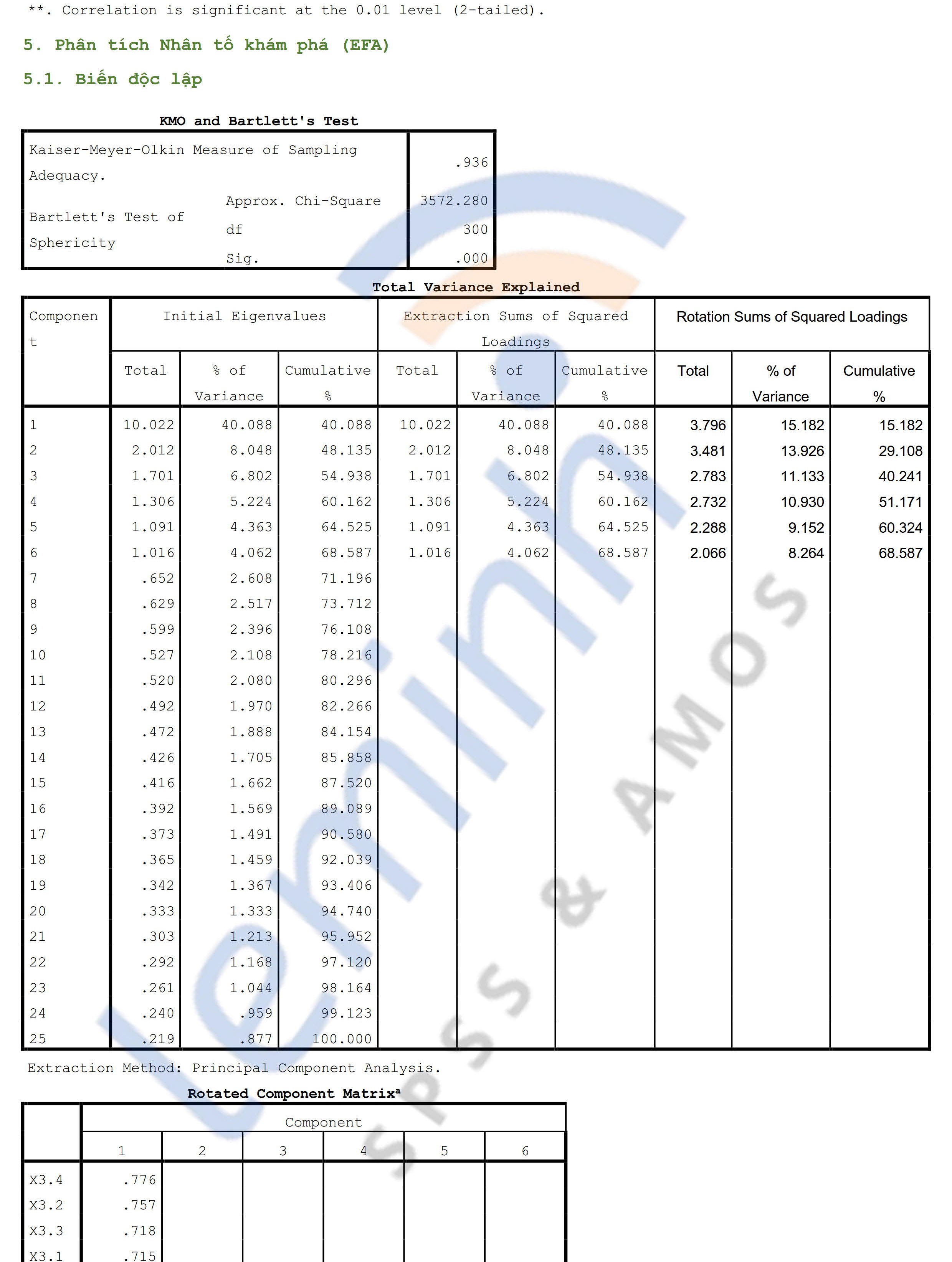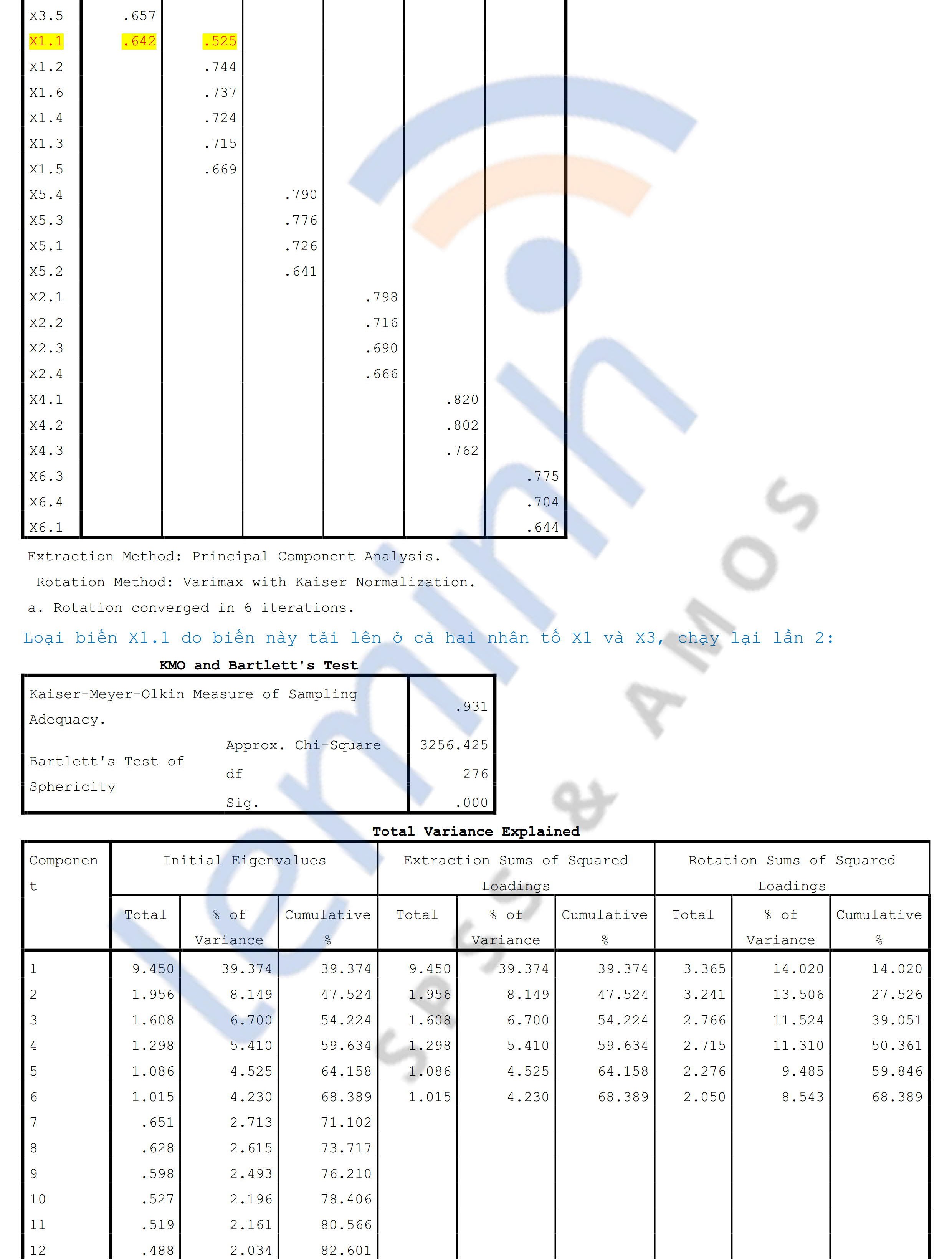 - EFA: Using Principal Components extraction and Varimax rotation, after 2 runs of EFA, good results are obtained. The observed variable eliminated in EFA is X1.1 (due to loading on two factors, X1 and X3.