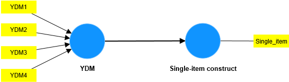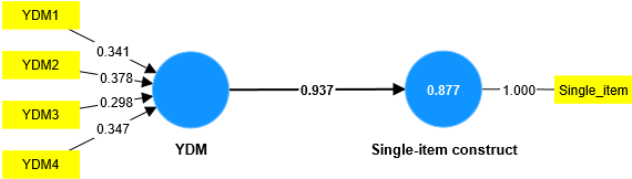 For this model, we see that there is only one concept, YDM, that is measured in a formative manner. Therefore, evaluating the measurement model requires evaluating the structural measurement model first, and then evaluating the reflective measurement model (we have presented the evaluation of the reflective measurement model in the following section). above).