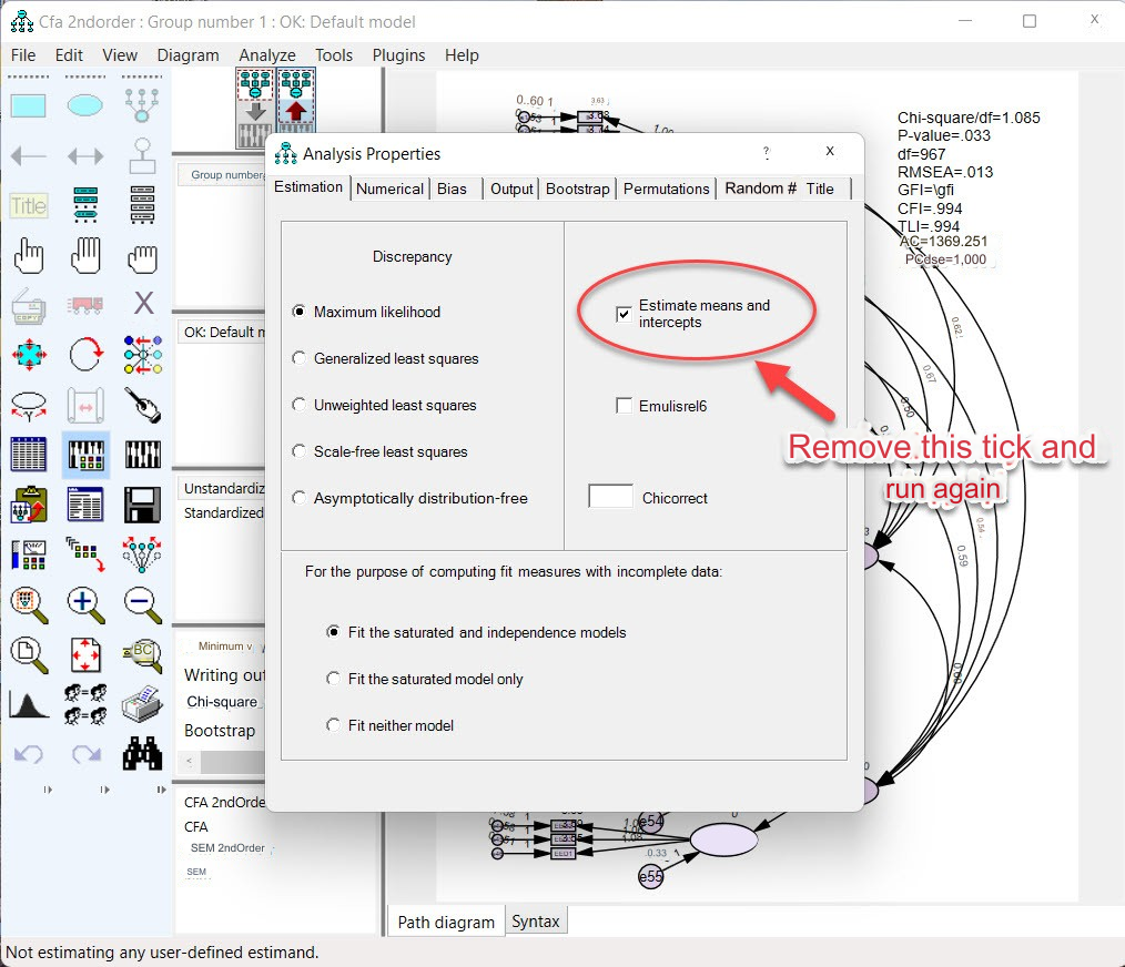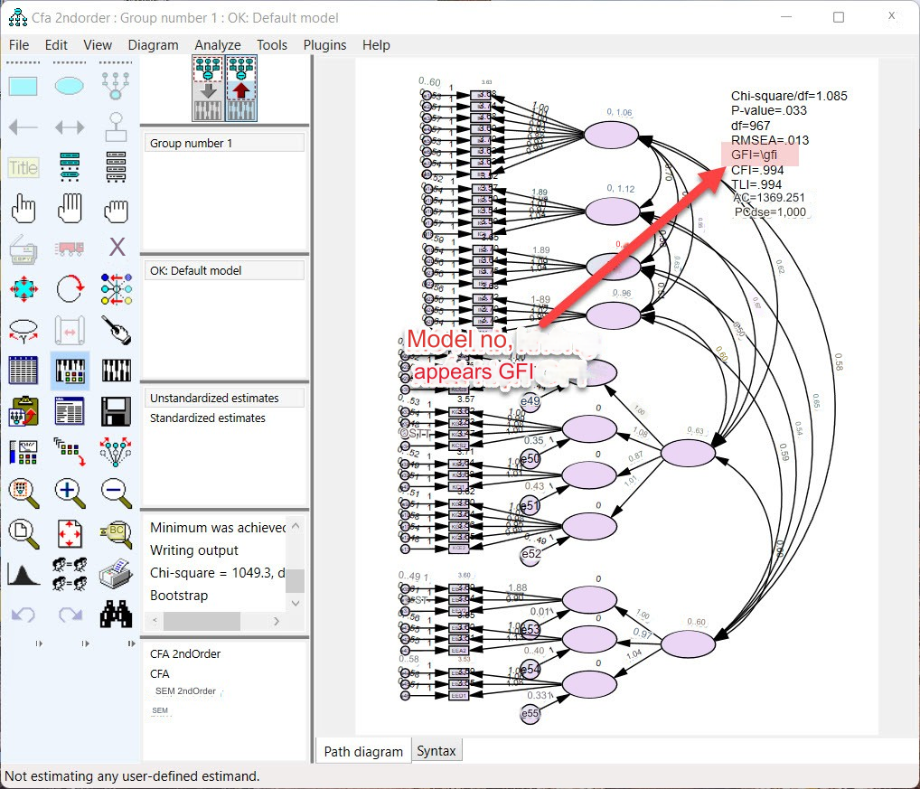 HOW TO FIX WHEN ANALYZING AMOS, THE GFI INDEX IN THE MODEL DOES NOT APPEAR.