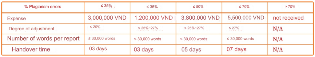 You may be wondering why the <20% level is so expensive, because adjusting from >30% to 25% is much easier, but adjusting from 25% to below 20% is extremely difficult. difficult. So when you have experience in handling plagiarism, you will understand. I also want to tell you that the current price offered by Le Minh is extremely friendly, and maybe in the future we will adjust this fee.