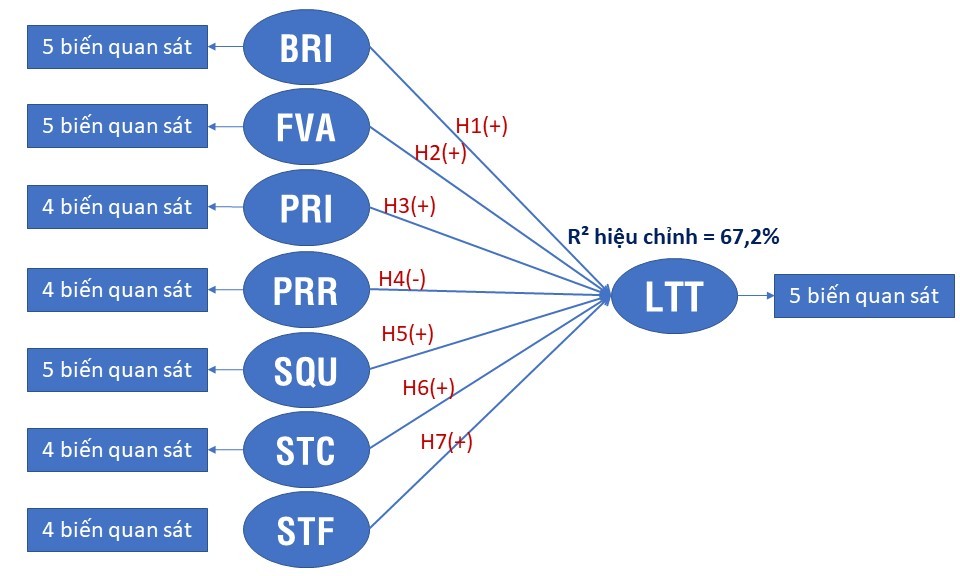 - Description: The model has 7 independent variables and 1 dependent variable, measured by 37 observed variables. For details, see the research model. The results of Cronbach’s alpha and EFA analysis were both good.