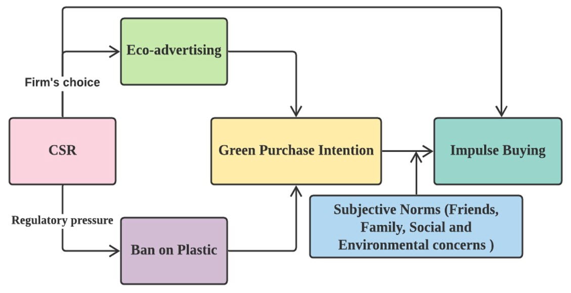 Consumers are becoming increasingly aware of the environmental and social impacts of their consumption habits. To engage in eco-friendly transactions, consumers require product information related to the environment. Consequently, marketers and companies are utilizing eco-friendly advertising tools to integrate detailed environmental information into their products, such as environmental advertising and bans on plastic. This study aims to examine the direct influence of environmental advertising and the ban on plastic on green impulse behavior and the mediating role of CSR green practices. Data were collected from a sample of participants, and the results suggest that environmental advertising and the ban on plastic significantly and positively influence green impulse behavior directly and through flexible dimensions of CSR green practices as a mediating mechanism. The study provides essential insights for companies and marketers to explore issues related to green impulse behavior and CSR green practices, thereby identifying the roles of environmental advertising and the ban on plastic.