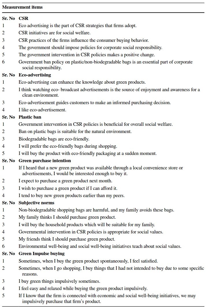 This data idea is built from the article by Hayat et al. (2022) – “Eco‑advertising and Ban‑on‑Plastic: the Influence of CSR Green Practices on Green Impulse Behavior.” This article studies the relationship between environmental advertising and plastic bans for corporate social responsibility (CSR) and their impact on consumers’ green shopping behavior. This article also examines the mediating roles of environmental advertising, plastic bans, consumers’ subjective consciousness, and their green shopping behavior in these relationships.