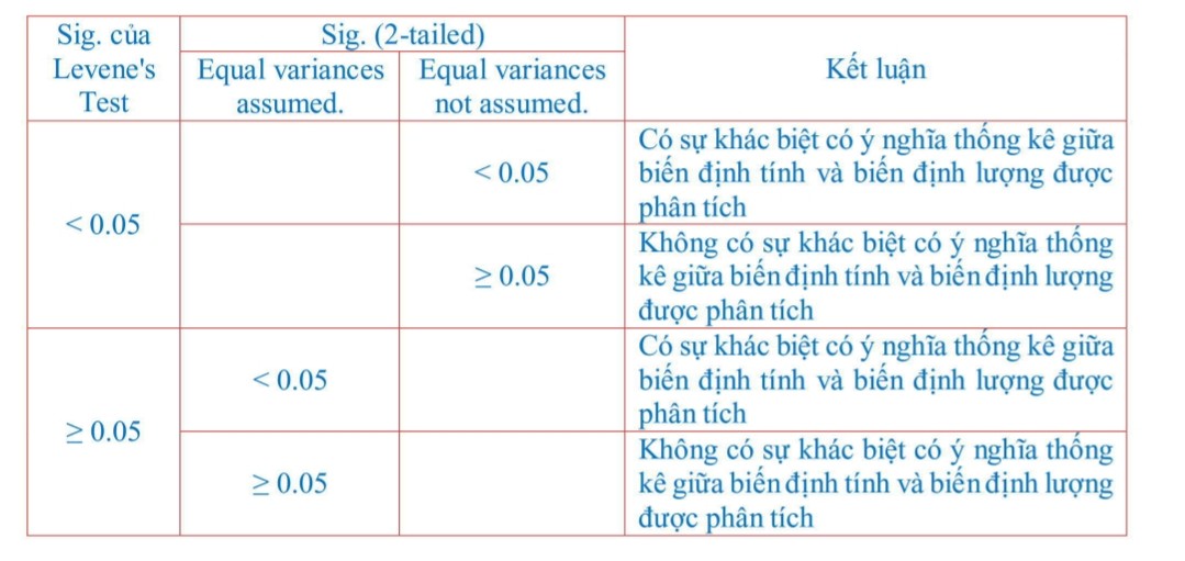 Khi chạy kiểm định T-test, các bạn đối chiếu với bảng sau đây để kết luận (Hoàng trọng và Châu Nguyễn Mộng Ngọc, 2008):